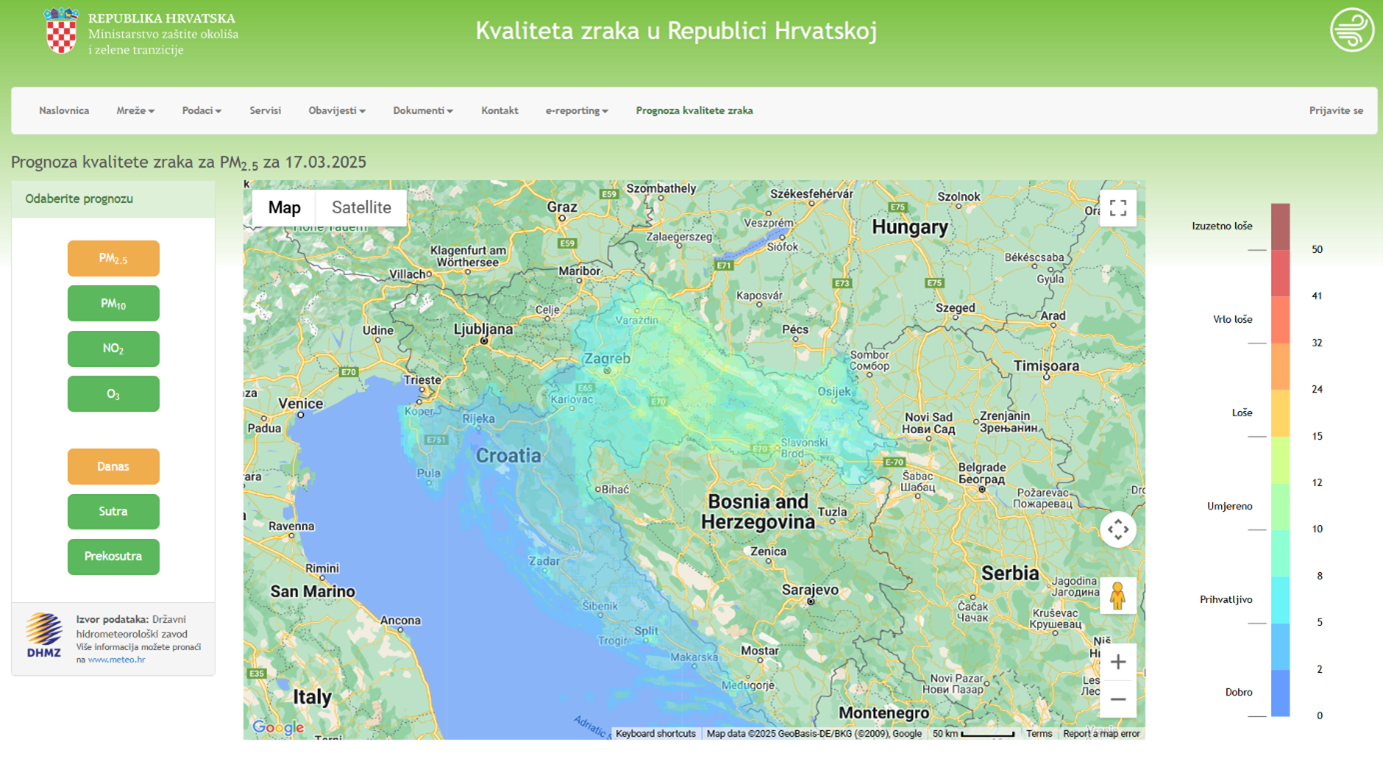 Državni hidrometeorološki zavod izradio je trodnevnu prognozu kvalitete zraka za Hrvatsku koja se prikazuje na internetskim stranicama DHMZ-a, a pregled podataka sada je dostupan i na nacionalnom p