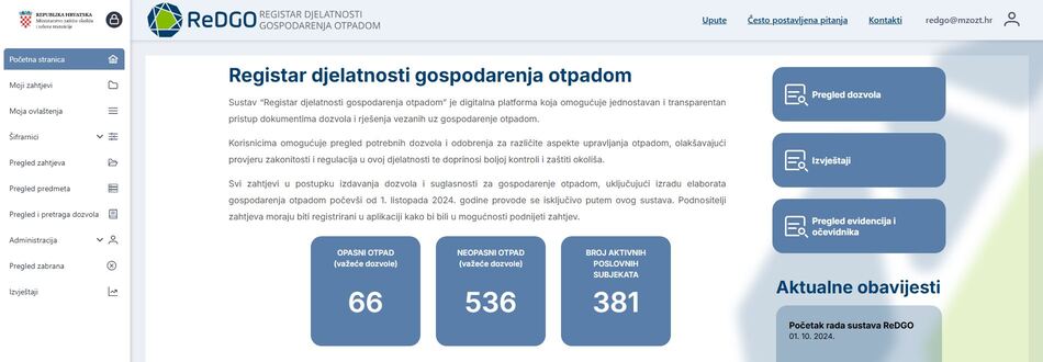 Svi zahtjevi u postupku izdavanja dozvola i suglasnosti za gospodarenje otpadom, uključujući izradu elaborata gospodarenja otpadom počevši od 1. listopada 2024. godine provode se isključivo putem ovog sustava. Podnositelji zahtjeva moraju biti registrirani u aplikaciji kako bi bili u mogućnosti podnijeti zahtjev.