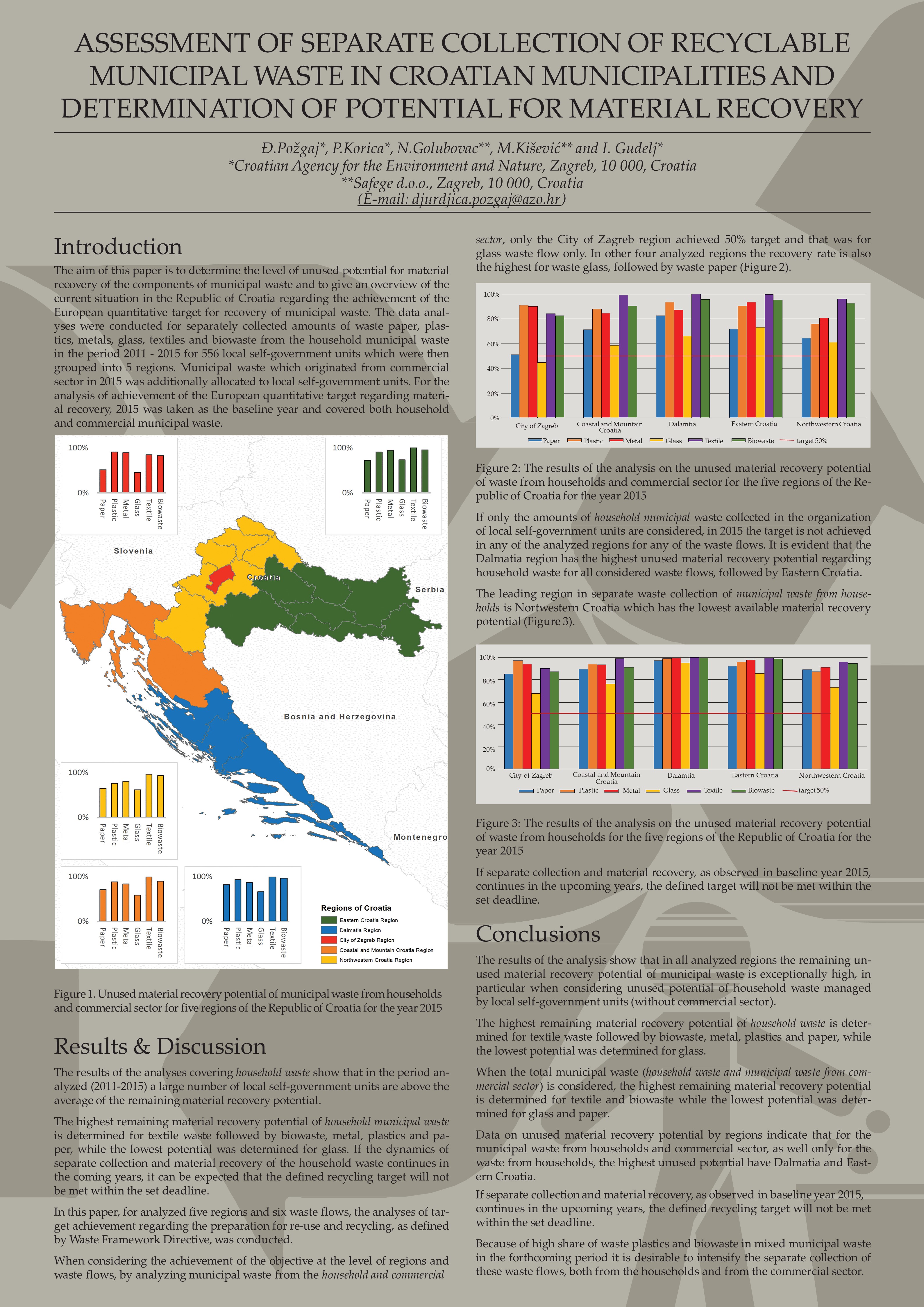 Djelatnici HAOP-a su za potrebe konferencije izradili rad naslova "Procjena odvojenog skupljanja komunalnog otpada koji se može reciklirati u Hrvatskim općinama/gradovima te određivanje potencijala za materijalnu oporabu" (Assessment of separate collection of recyclable municipal waste in Croatian municipalities and determination of potential for material recovery). Rad je napisan s ciljem određivanja razine neiskorištenog potencijala za materijalnu oporabu komponenata komunalnog otpada i kako bi se dao pregled trenutne situacije u Republici Hrvatskoj u pogledu dostizanja europskih kvantitativnih ciljeva za oporabu komunalnog otpada. Analize podataka napravljene su za odvojeno prikupljene količine otpadnog papira, plastike, metala, stakla, tekstila i biootpada iz komunalnog otpada u periodu 2011-2015 godine za 556 jedinica lokalne samouprave koje su grupirane u 5 regija.
