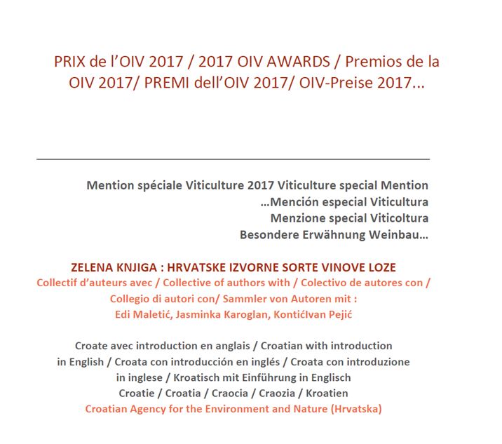 Međunarodna organizacija za vinogradarstvo i vinarstvo prepoznala je vrijednost Zelene knjige: Hrvatske izvorne sorte vinove loze i dodijelila joj vrijednu nagradu.